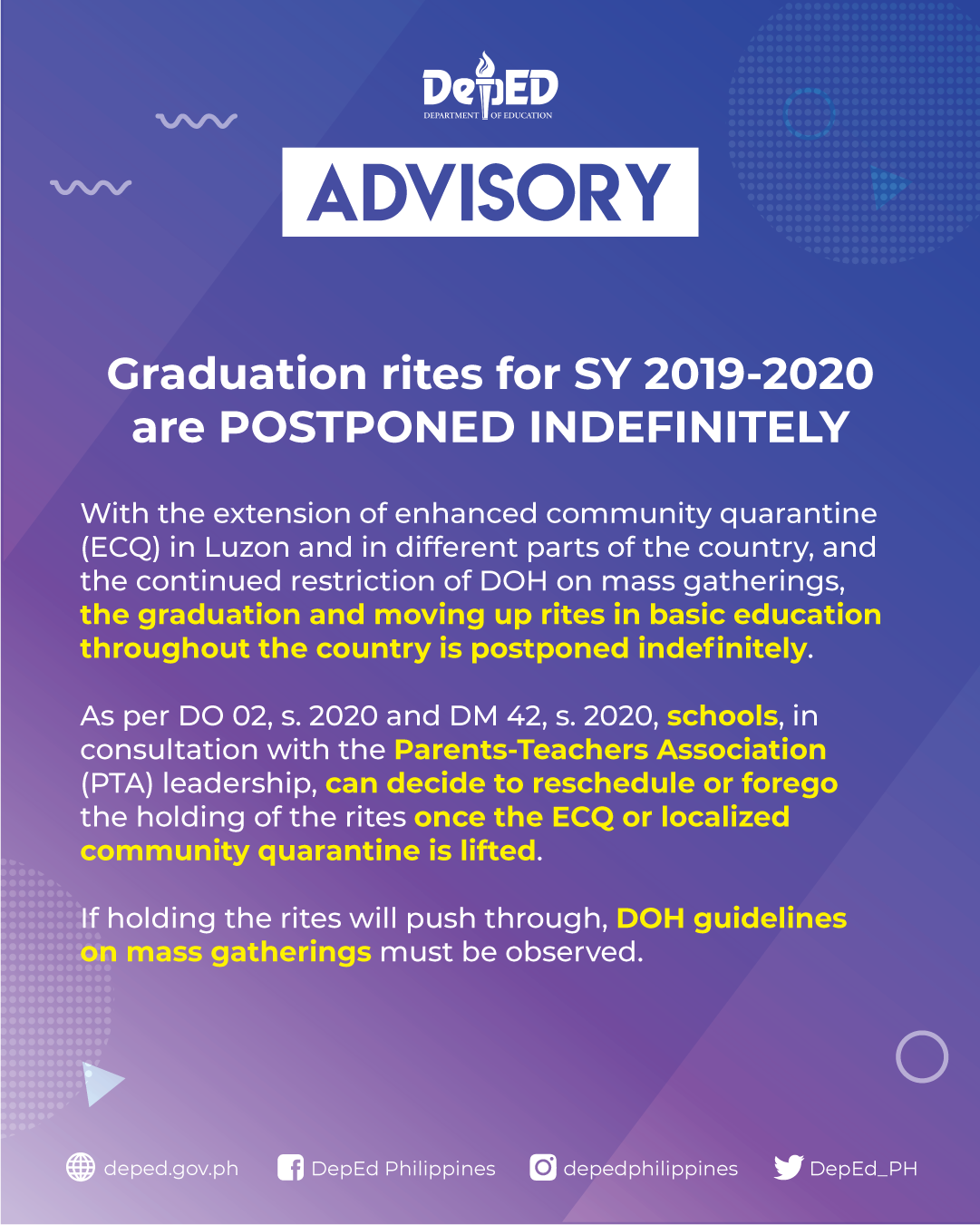 “With the extension of enhanced community quarantine (ECQ) in Luzon and in different parts of the country, and the continued restriction of DOH on mass gatherings, the graduation and moving up rites in basic education throughout the country is postponed indefinitely”, the DepEd said in a statement.