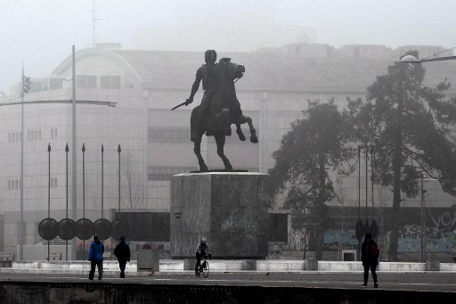 People walk past a statue of “Alexander the Great” on the waterfront of Thessaloniki on January 17, 2018./ AFP / Sakis Mitrolidis/