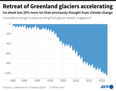 “Nearly every glacier in Greenland has thinned or retreated over the past few decades,” lead author Chad Greene, a glaciologist from NASA’s Jet Propulsion Laboratory, told AFP.