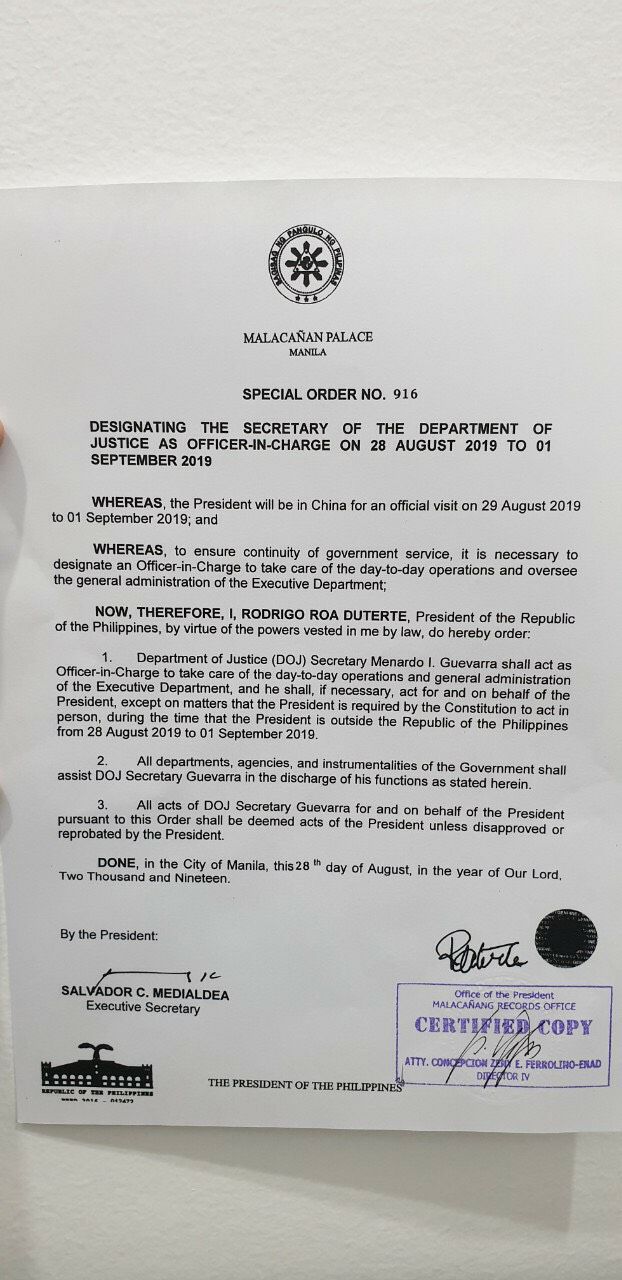Special Order No. 916 signed by Executive Secretary Salvador Medialdea and by Duterte said Guevarra shall be officer-in-charge from Aug. 28 to Sept. 1.