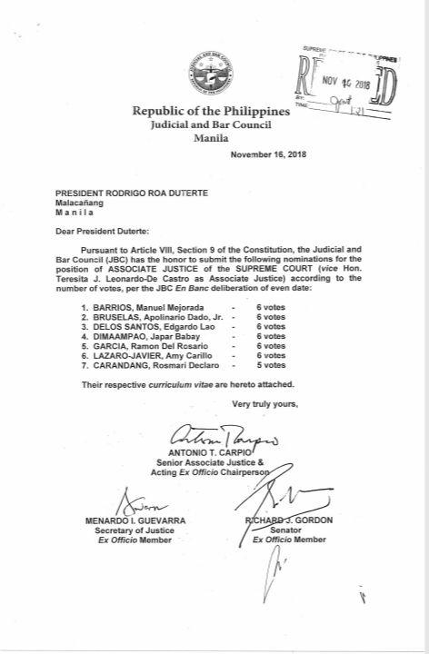 Included in the shortlist were Justices Manuel Mejorada Barrios, Apolinario Dado Bruselas, Edgardo Lao Delos Santos, Japar Babay Dimaampao, Ramon Del Rosario Garcia, Amy Carillo Lazaro-Javier and Rosmari Declaro Carandang.