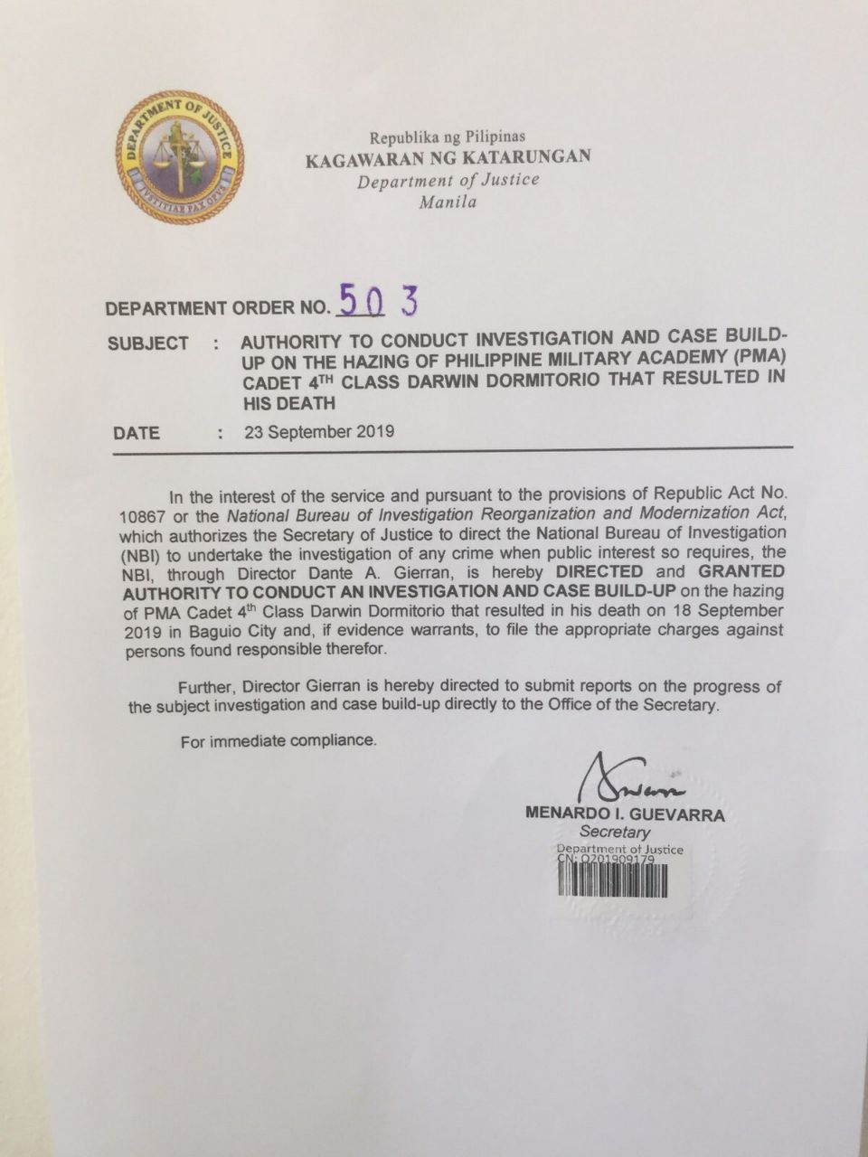 (Eagle News)–Justice Secretary Menardo Guevarra has ordered the National Bureau of Investigation to probe the death of Cadet 4th Class Darwin Dormitorio.