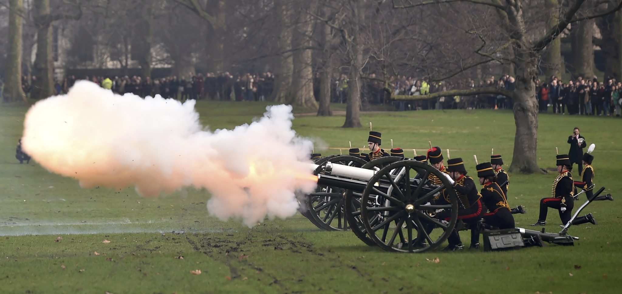 Guns are fired during the King’s Troop Royal Horse Artillery Royal 41-gun salute to mark the start of Queen Elizabeth’s Blue Sapphire Jubilee year at Green Park in central London, Britain, February 6, 2017. REUTERS/Hannah McKay