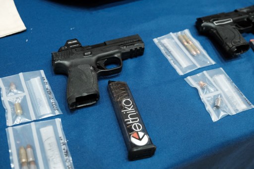 NEW YORK, NEW YORK – MAY 25: Guns confiscated at New York City public schools are displayed at a news conference with Mayor Eric Adams at police headquarters to speak about guns in public schools in New York City on May 25, 2022 in New York City. The appearance by the mayor comes a day after twenty one people are confirmed dead including nineteen children in the state of Texas. So far the NYPD has recovered over 5000 “dangerous instruments,” including twenty firearms, so far this year in city schools. Spencer Platt/Getty Images/AFP (Photo by SPENCER PLATT / GETTY IMAGES NORTH AMERICA / Getty Images via AFP)