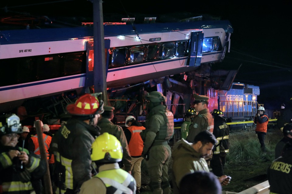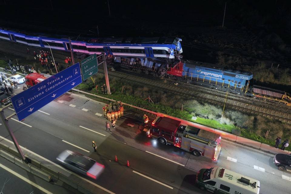 View of the two trains that collided in the commune of San Bernardo, in Santiago early in the morning on June 20, 2024. – Two people were killed and several injured following the head-on collision between a goods train and a test train on the outskirts of Chile’s capital, the railway company reported. (Photo by Javier TORRES / AFP)Firefighters and police members stand nearby the two trains that collided in the commune of San Bernardo, in Santiago early in the morning on June 20, 2024. – Two people were killed and several injured following the head-on collision between a goods train and a test train on the outskirts of Chile’s capital, the railway company reported. (Photo by Javier TORRES / AFP)Aerial view of the two trains that collided in the commune of San Bernardo, in Santiago early in the morning on June 20, 2024. – Two people were killed and several injured following the head-on collision between a goods train and a test train on the outskirts of Chile’s capital, the railway company reported. (Photo by Javier TORRES / AFP)