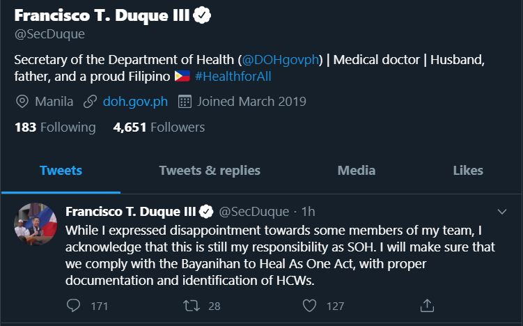 “While I expressed disappointment towards some members of my team, I acknowledge that this is still my responsibility as SOH (Secretary of Health),” the Health chief said in a Tweet.