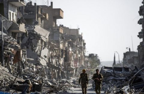 Fighters of the Syrian Democratic Forces (SDF) walk down a street in Raqa past destroyed vehicles and heavily damaged buildings on October 20, 2017, after a Kurdish-led force expelled Islamic State (IS) group fighters from the northern Syrian city, formerly their “capital”.