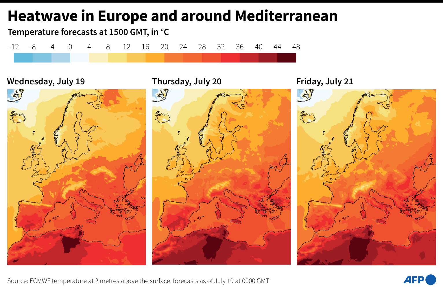 PARIS, July 20, 2023 (AFP) – Struck by near-record temperatures and wildfires during this week’s heatwave, the Mediterranean region is ranked as a climate-change “hot spot” by scientists.