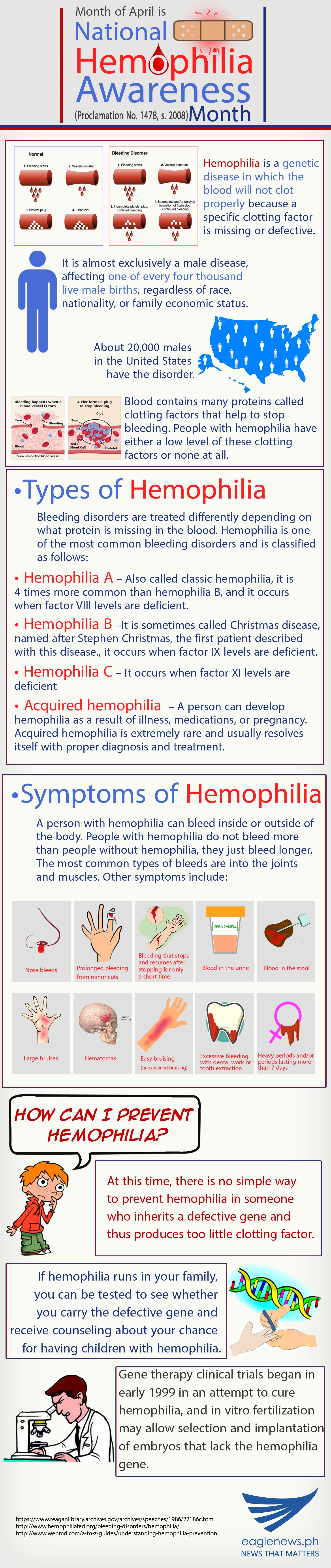 Hemophilia is a genetic disease in which the blood will not clot properly because a specific clotting factor is missing or defective. It is almost exclusively a male disease, affecting one of every four thousand live male births, regardless of race, nationality, or family economic status.