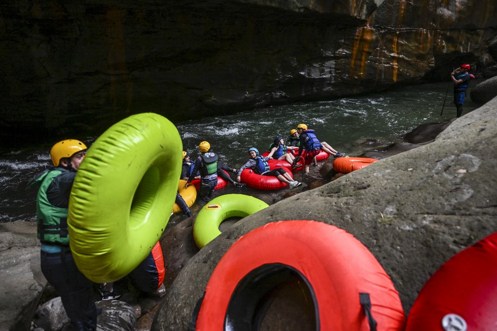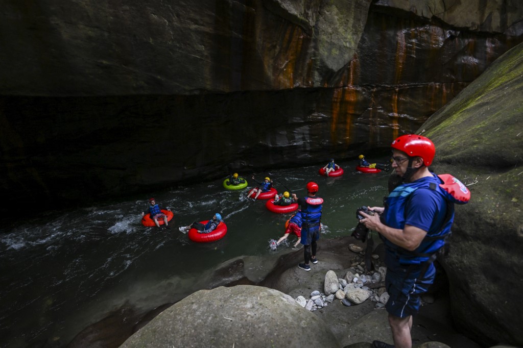 But today tourists bob happily down it in multi-colored inflatables, accompanied by birdsong and the rush of water.