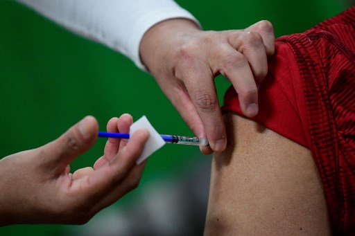 A nurse applies a dose of the AstraZeneca vaccine against COVID-19 during the first day of the application of the third dose to people over 60 years-old at the Centro de Estudios Superiores Navales (CENCIS) in Mexico City, on December 7, 2021. (Photo by Pedro PARDO / AFP)