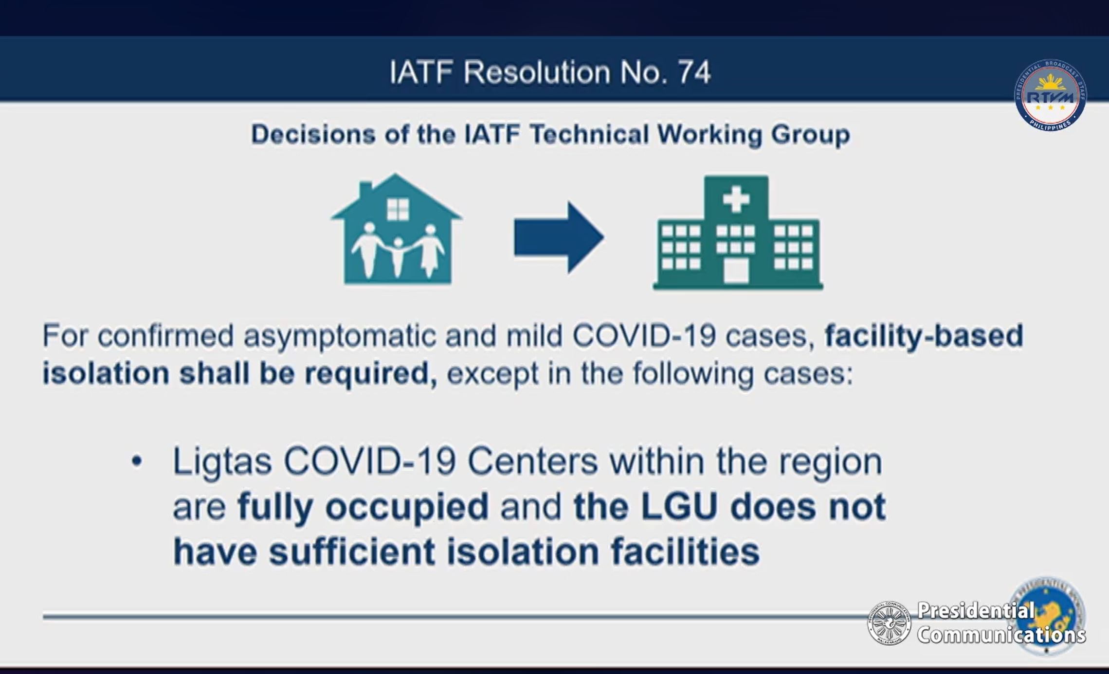 Presidential Spokesperson Harry Roque revealed that the IATF had ratified the decision of the technical working group to prohibit home quarantine for such COVID-19 cases, but that there are exemption to this.