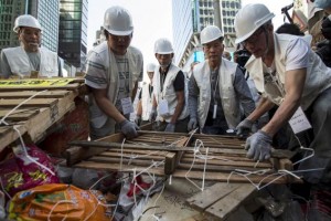 Workers dismantle a barricade at a small section in the Mongkok protest site after a court issued an eviction order in Hong Kong November 25, 2014.