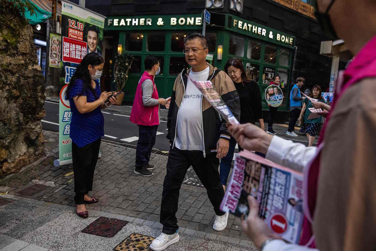 A man (C) walks past people handing out leaflets for candidates during the district council election in Hong Kong on December 10, 2023. (Photo by ISAAC LAWRENCE / AFP)