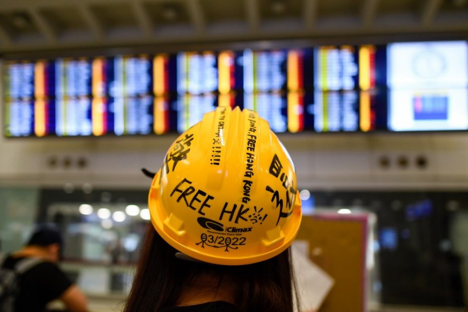 The expression was also spray-painted in Chinese at several places in the airport, where many demonstrators wore eye patches or bandages in solidarity with the wounded woman.