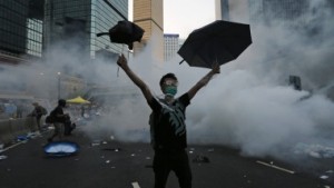A protester (C) raises his umbrellas in front of tear gas which was fired by riot police to disperse protesters blocking the main street to the financial Central district outside the government headquarters in Hong Kong, September 28, 2014. Hong Kong police used tear gas for the first time on Sunday to disperse pro-democracy protests and baton-charged the crowd blocking a key road in the government district after Hong Kong and Chinese officials warned against illegal demonstrations. REUTERS/Tyrone Siu (CHINA – Tags: CIVIL UNREST POLITICS TPX IMAGES OF THE DAY)