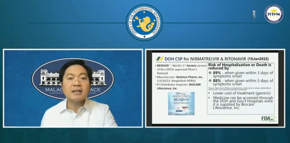This anti-viral drug could be used by COVID-19 patients in the first three days of showing of symptoms, and is seen to reduce hospitalization or death by 89 percent, according to acting Presidential Spokesperson Cabinet Secretary Karlo Alexei Nograles.