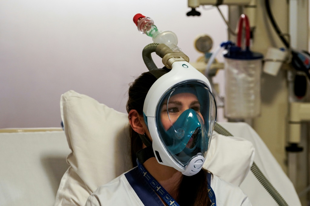Brussels, Belgium (AFP) — As hospitals face an overload of COVID-19 patients struggling to breathe, innovative medical staff are turning to snorkelling masks from sports stores to stop their lungs collapsing.