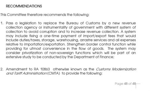 Photo grab of part of the report containing the recommendations for the Bureau of Customs by the House Committee on Dangerous Drugs