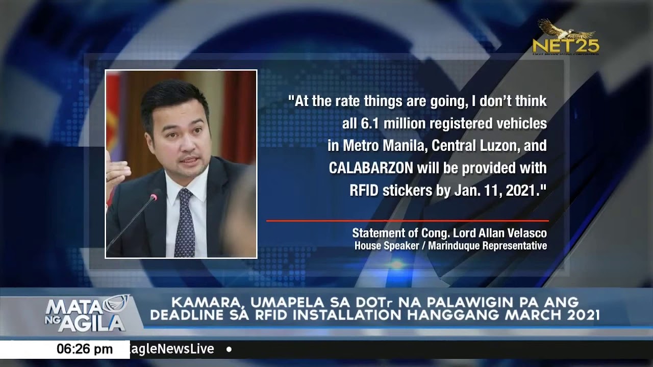 (Eagle News) — House Speaker Lord Allan Jay Velasco urged the Department of Transportation to extend the period for the installation of radio-frequency identification (RFID) stickers to March next year, instead of January 11.