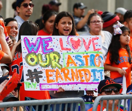 As the Astros celebrated their win, countless fans lined the streets — many clad in the team colors of orange, navy blue and white.