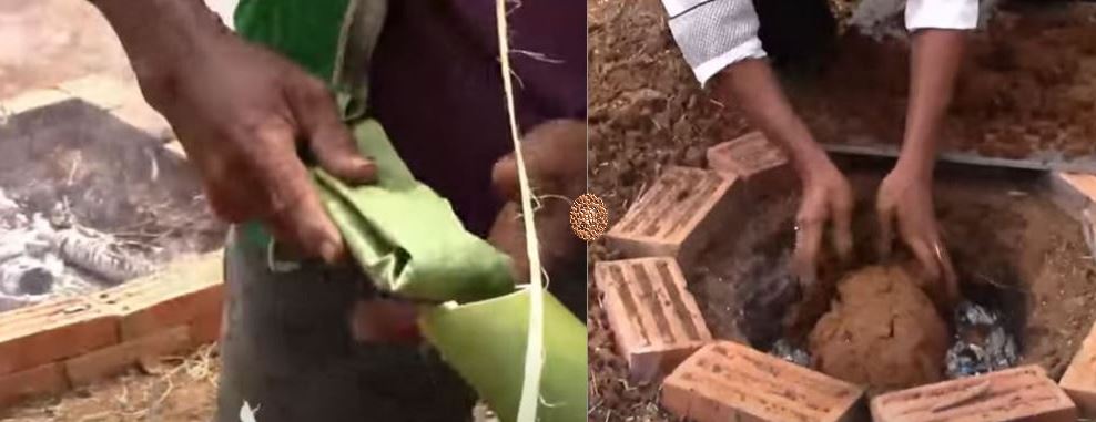 The clay-covered chicken is placed in a hole in the ground, and covered with dried grass (dayami) which is then set on fire. This will serve as the undergound oven that will cook the meat inside.