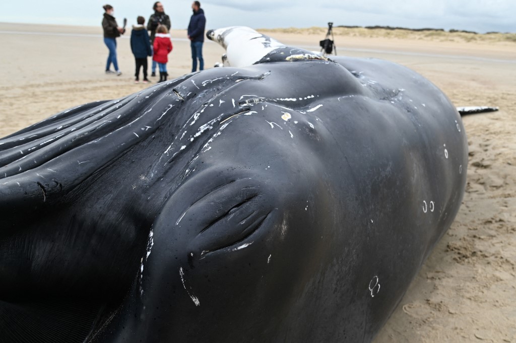 A dead humpback whale is pictured on February 10, 2022 on a beach near Calais. – A humpback whale measuring almost ten metres washed up on February 10 on a beach in the Pas-de-Calais region, between Calais and Marck, according to AFP, an “exceptional” phenomenon according to a specialist. (Photo by Denis Charlet / AFP)