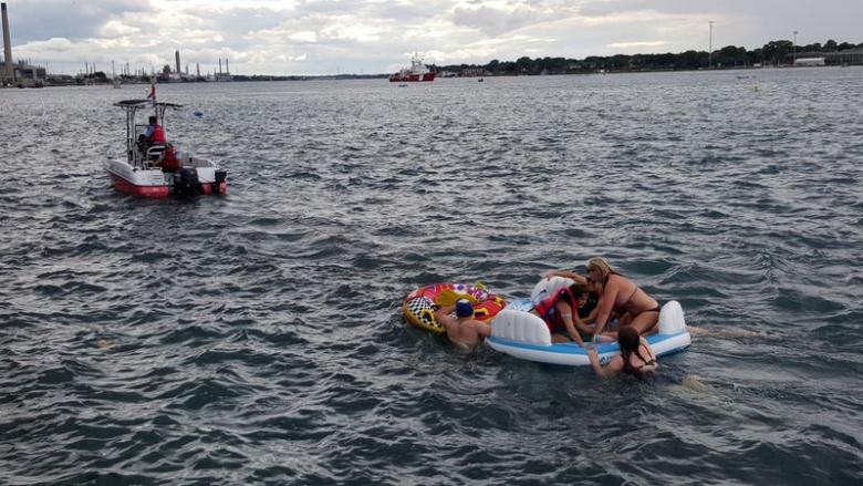The winds blew the flotilla of inflatable rafts and inner tubes off course and toward the Canadian shore. Some rafts deflated, spurring a rescue effort by the Canadian Coast Guard as well as federal and provincial police, coast guard spokeswoman Carol Launderville said in an email.