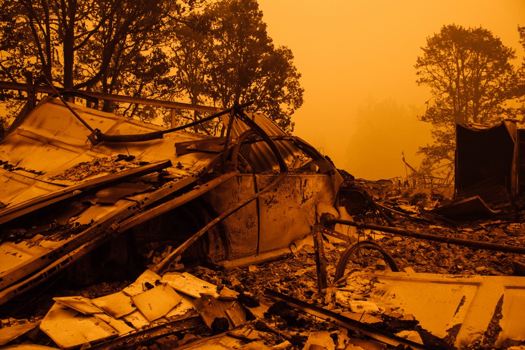 An orange smoke-filled sky and burnt remains are seen after the passage of the Santiam Fire in Gates, Oregon, on September 10, 2020. – California firefighters battled the state’s largest ever inferno on September 10, as tens of thousands of people fled blazes up and down the US West Coast and officials warned the death toll could shoot up in coming days. At least eight people have been confirmed dead in the past 24 hours across California, Oregon and Washington, but officials say some areas are still impossible to reach, meaning the number is likely to rise. (Photo by Kathryn ELSESSER / AFP)