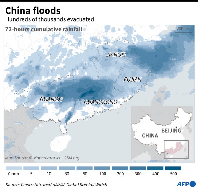 BEIJING, China (AFP) — The heaviest rainfall in decades has triggered floods and landslides in southern China, forcing the evacuation of hundreds of thousands of people, state media reported.