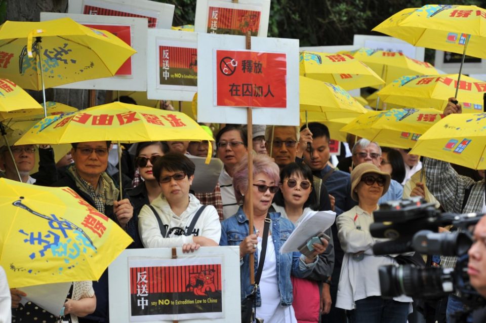 The demonstrators carried signs against the extradition law and yellow umbrellas as a nod to the series of 2014 pro-democracy protests in Hong Kong that are known as the “Umbrella Movement.”