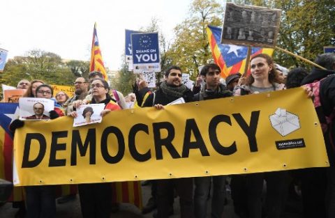 The protest, just meters from the European Union’s main institutions, came a day after hundreds of thousands of Catalans protested the jailing of regional officials for their push for independence from Spain.