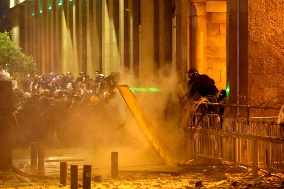 Thick clouds of white tear gas billowed in central Beirut, as police pushed protesters out of a flashpoint road near parliament after hours of clashes before the downpour largely cleared the streets.