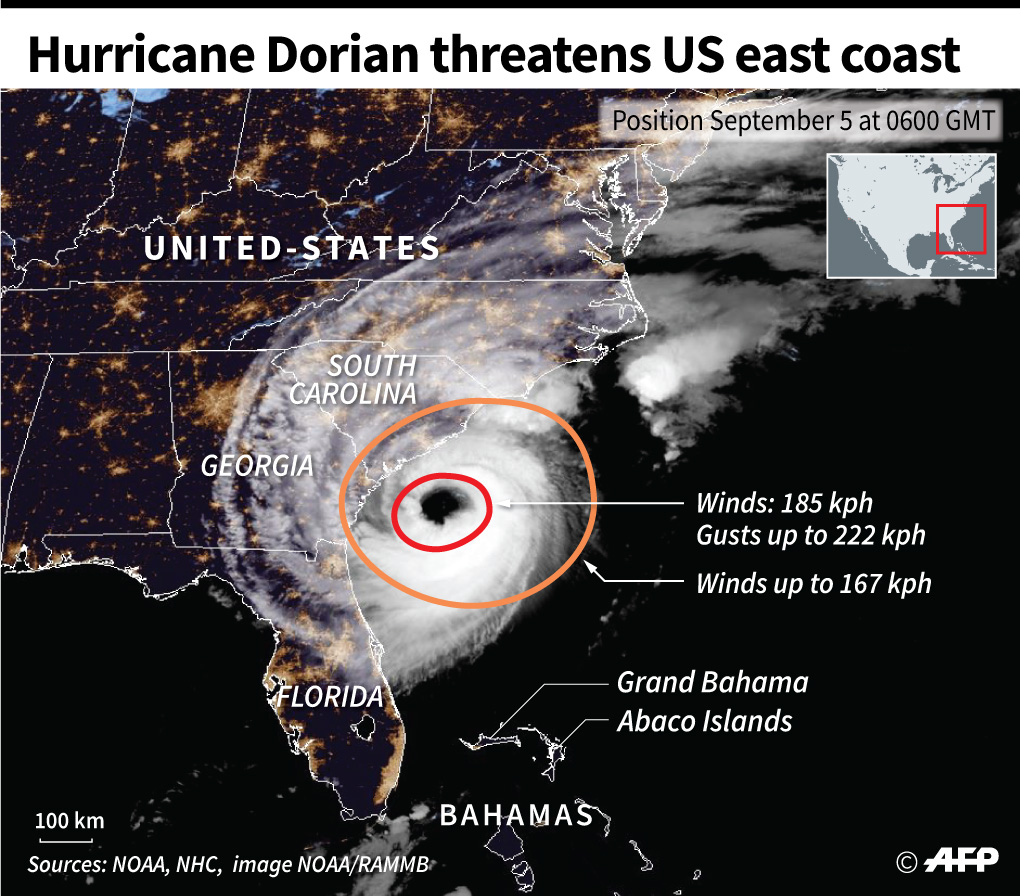 CHARLESTON, United States (AFP) — Hurricane Dorian lashed the Carolinas with driving rain and fierce winds as it neared the US east coast Thursday after devastating the Bahamas and killing at least 20 people.