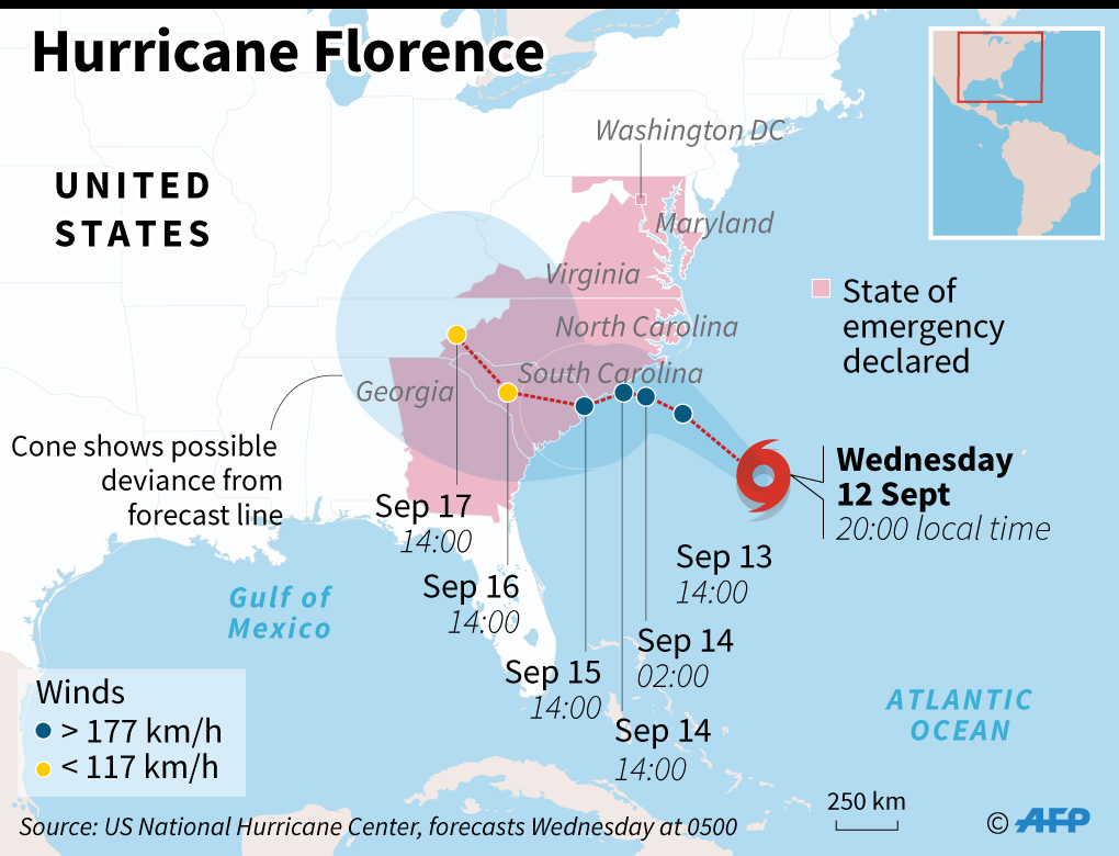 WILMINGTON, United States (AFP) — Hurricane Florence weakened to a Category 2 storm on Wednesday, according to the National Hurricane Center, but remained on course to deliver a powerful blow to the US east coast.