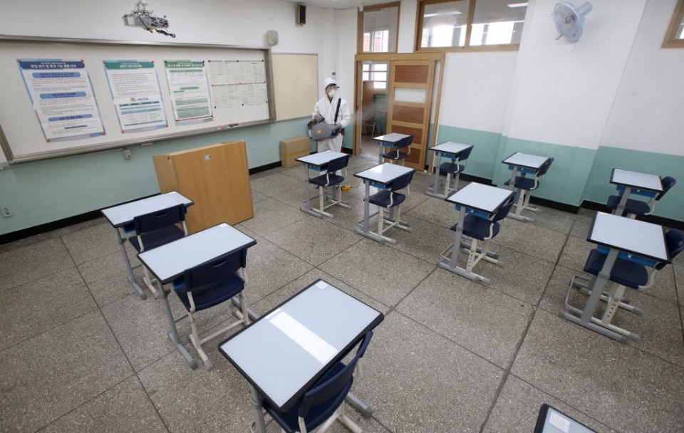 A worker wearing protective gear sprays disinfectant in an exam hall at a high school in Seoul on November 17, 2021, a day before a high-stakes university entrance exam amid the COVID-19 coronavirus pandemic. (Photo by Dong-a Ilbo / AFP)