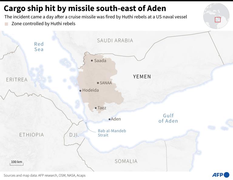 DUBAI, Jan 15, 2024 (AFP) – Yemen’s Huthi rebels hit a US-owned cargo vessel with a missile on Monday, the US military said, heightening fears for the volatile region after repeated attacks on shipping triggered American and British strikes.