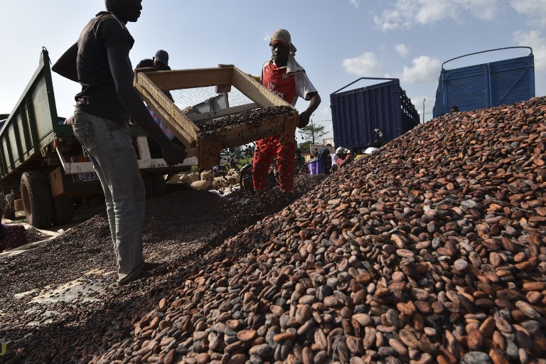 People work at a cocoa sorting center on March 6, 2017 in Sobre. Ivory Coast is the world’s largest producer of cocoa. / AFP Photo / Sia Kambou