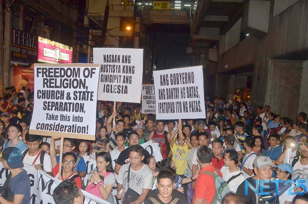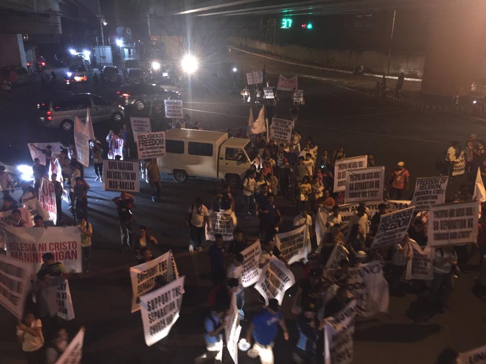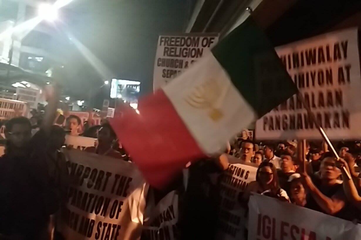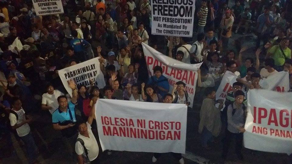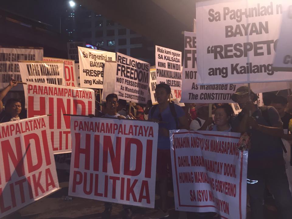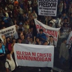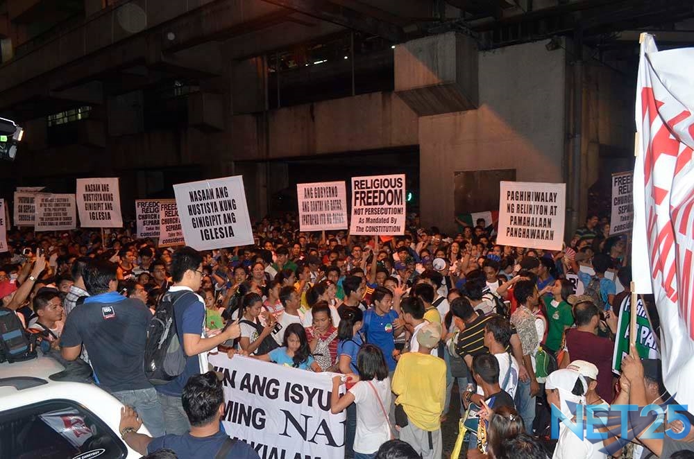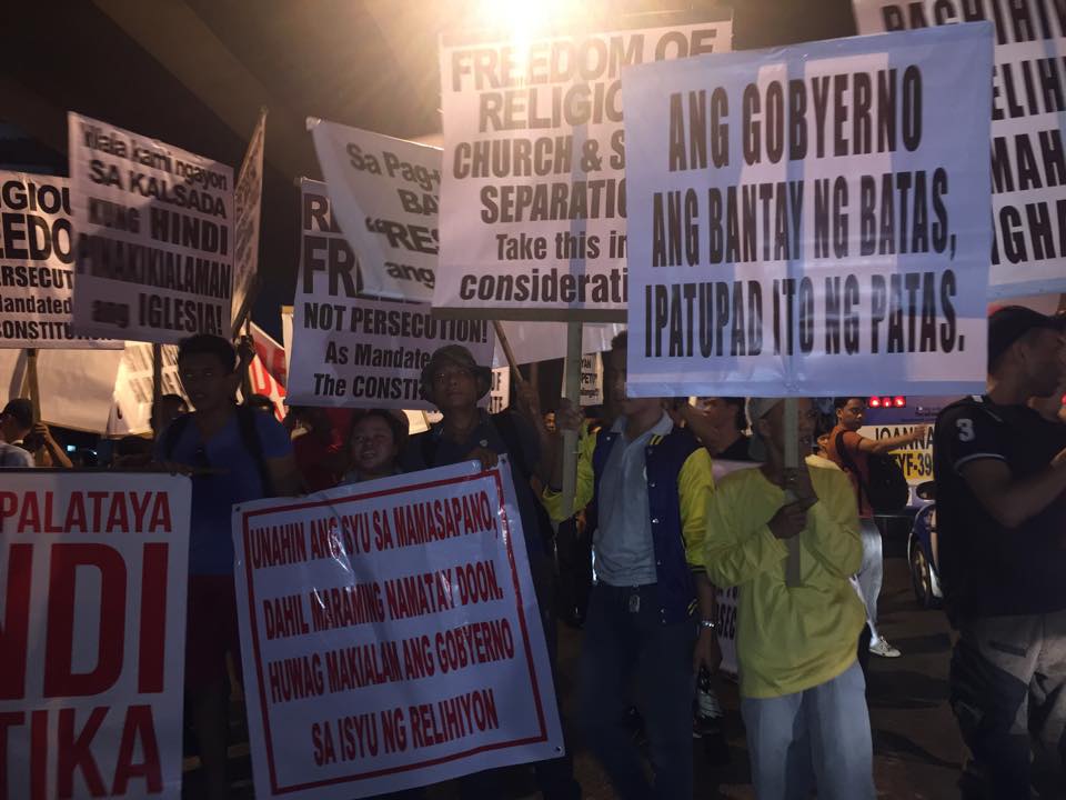 Members of the Iglesia Ni Cristo wave numerous signs and placards signifying their message and grievances as they continue their activity with passion, without any sign of tiredness.