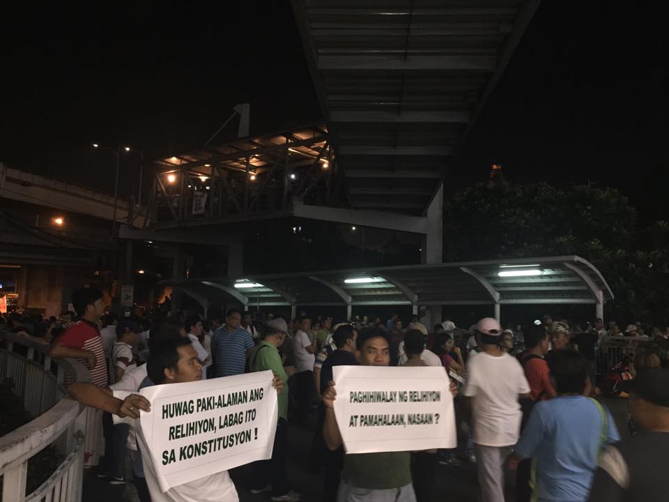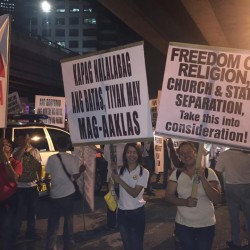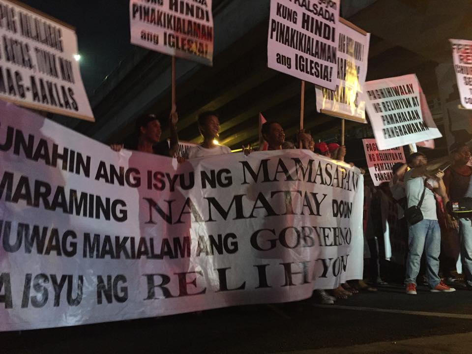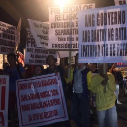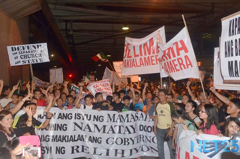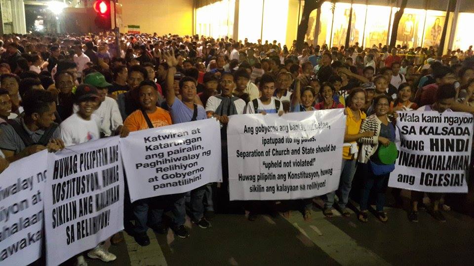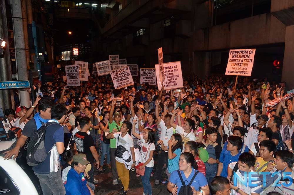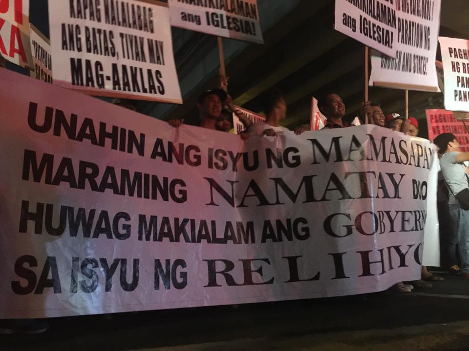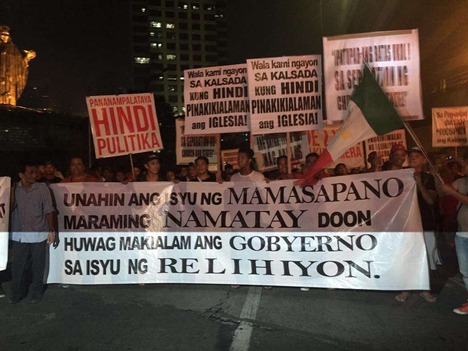 Members of the Iglesia Ni Cristo wave numerous signs and placards signifying their message and grievances as they continue their activity with passion, without any sign of tiredness.