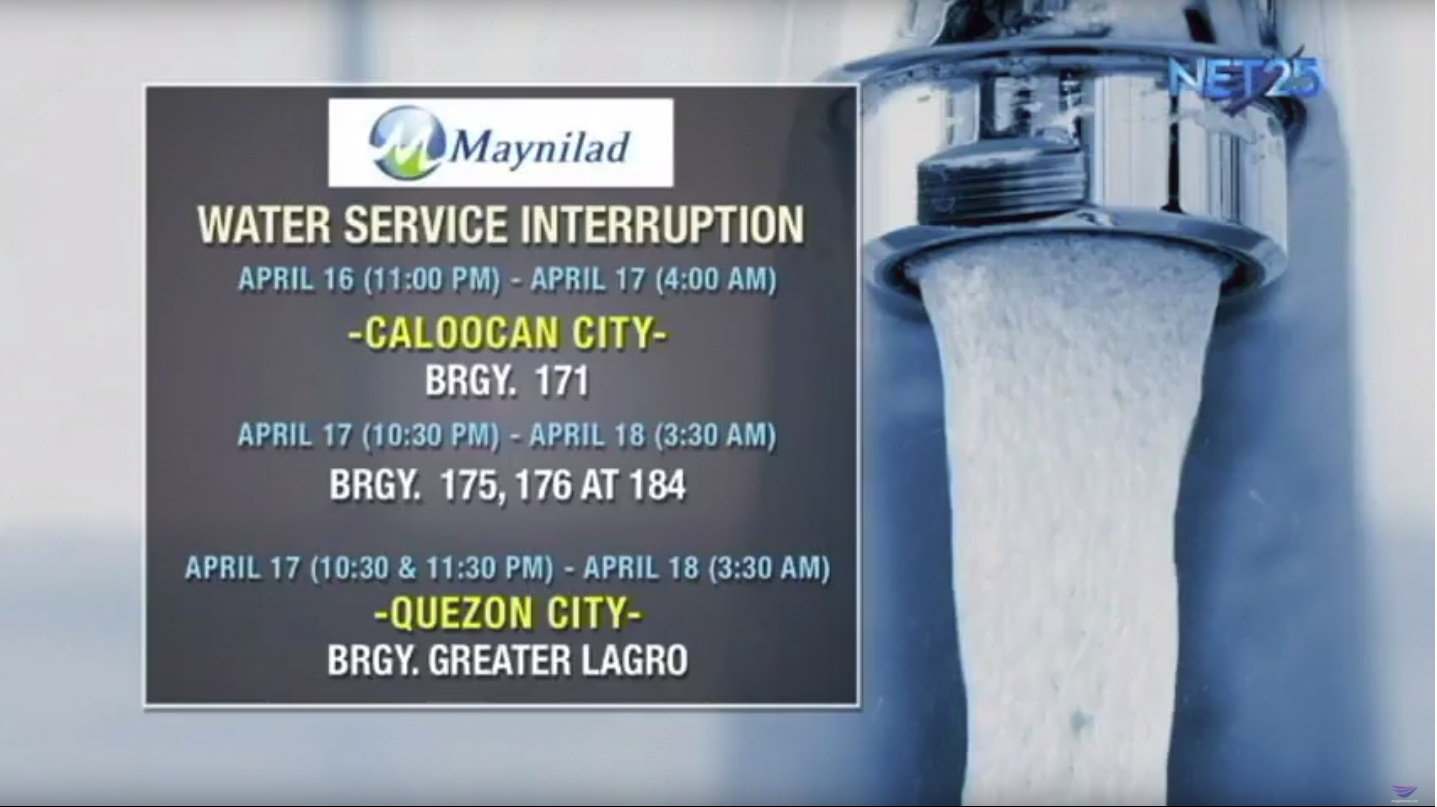 Itong Martes, Abriel 17, apektado naman ng water interruption ang bahagi ng Brgy. 175 sa Caloocan City simula 10:30 ng gabi hanggang 3:30 ng umaga ng Miyerkules, Abril 18.
