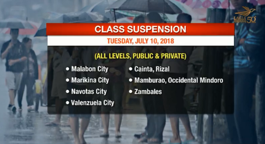 Walang pasok sa lahat ng antas sa mga sumusunod na lugar: Malabon City, Marikina City, Navotas City at Valenzuela City.