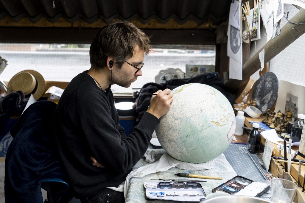 It was littered with half-finished globes as his team of two dozen illustrators, painters, cartographers, constructors, engravers and woodworkers toiled beneath strips of paper drying on washing lines overhead.