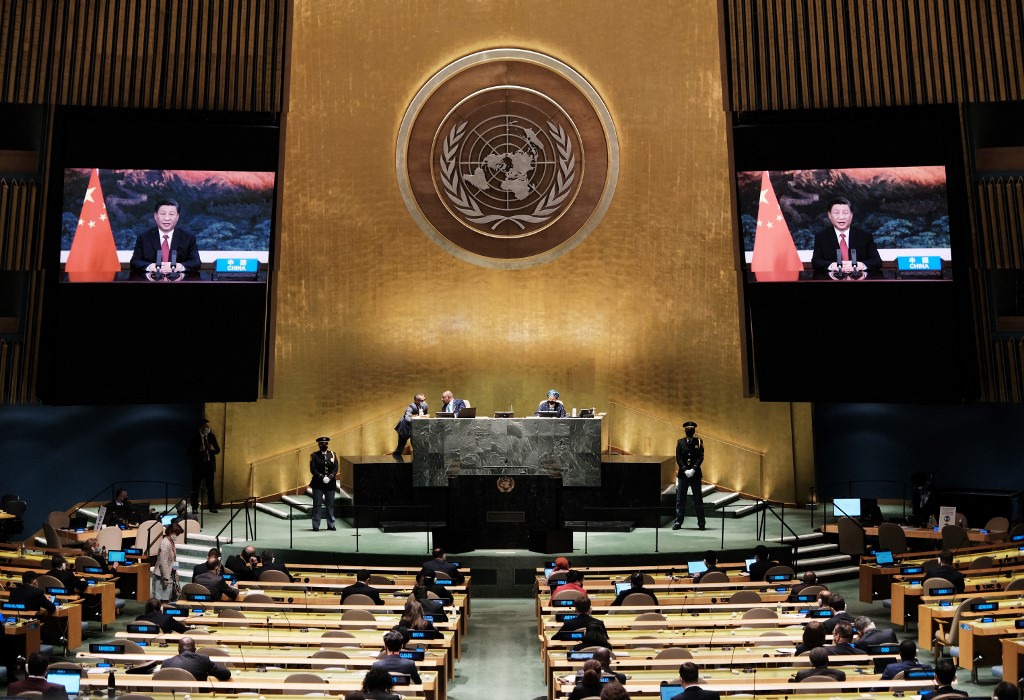 Chinese president Xi Jinping virtually addresses the 76th Session of the UN General Assembly on September 21, 2021 in New York. (Photo by Spencer Platt / POOL / AFP)