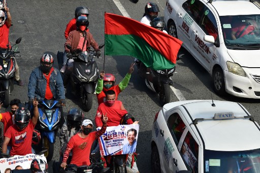 This photo taken on December 8, 2021 shows supporters of presidential candidate Bongbong Marcos, son of the late Philippine dictator Ferdinand Marcos, riding on motorbikes displaying posters during a motorcade along a street in Quezon City, suburban Manila. – Philippine election candidates hit the hustings on February 8, 2022 for the three-month campaign season in a chaotic and colourful charm offensive aimed at wooing millions of voters (Photo by Ted ALJIBE / AFP)