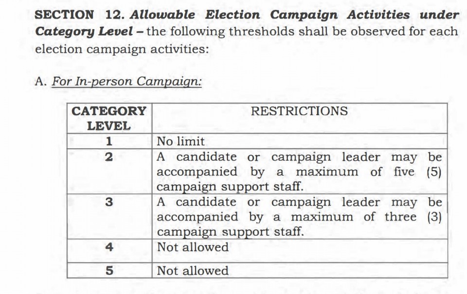 Under Covid-19 alert level 2, “a candidate or campaign leader may be accompanied by a maximum of five (5) campaign support staff. Under Alert Level 3, he may be accompanied by a maximum of three campaign support staff. For alert levels 4 and 5, this is not allowed.