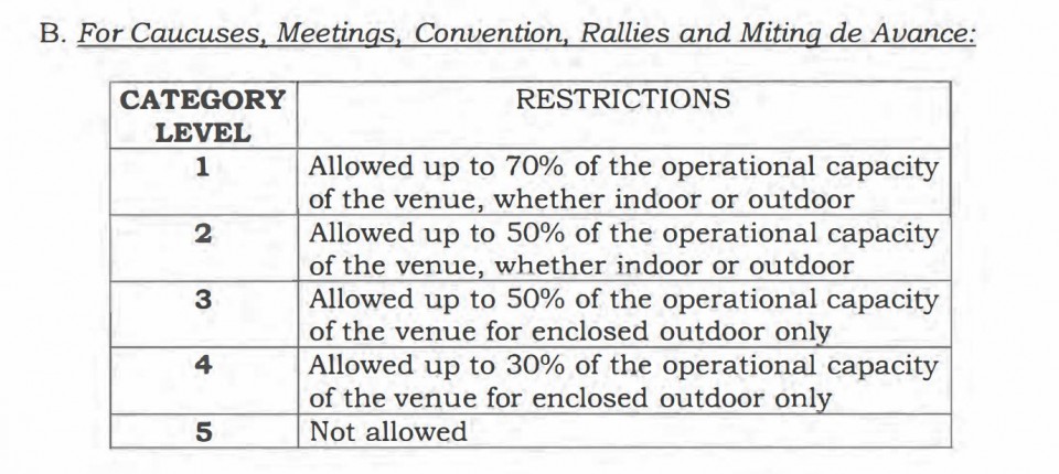 As to the restriction on campaign venues, under Alert Level 1, up to 70% of the operational capacity of a campaign venue is allowed, whether indoor or outdoor. Under Alert Level 2, up to 50% of the operational capacity of the venue is allowed; and for Alert Level 3, up to 50% of the operational capacity of the venue for enclosed outdoor is allowed. For Alert Level 4, up to 30% of the operational capacity of the venue “for enclosed outdoor only” is allowed.