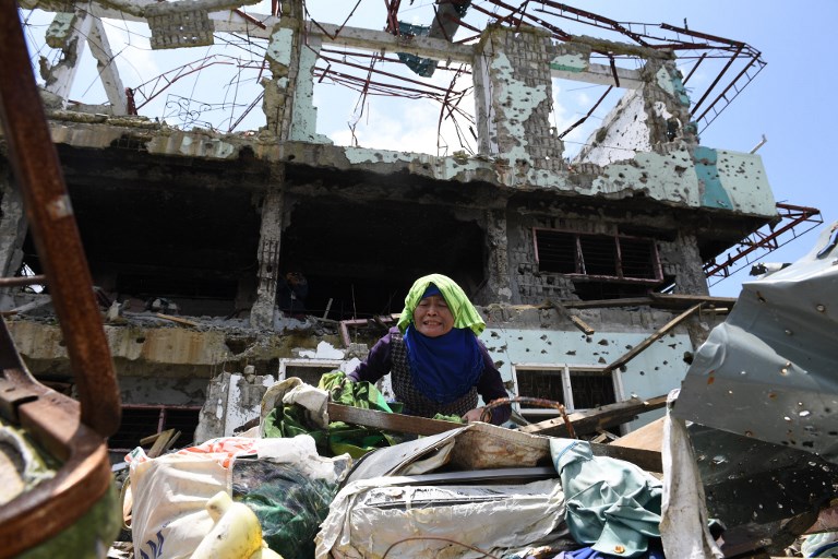 In photo: A Marawi City resident tries to look for salvageable belongings from destroyed home