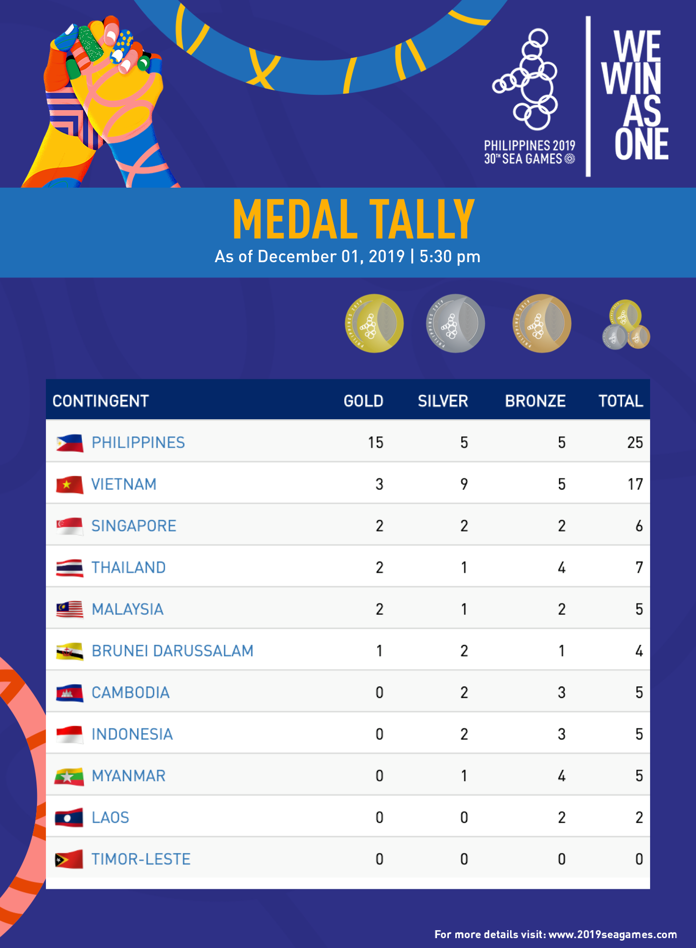 (Eagle News)–This updated medal tally from Southeast Asian Games 2019 organizers as of 5:30 p.m. shows host country Philippines still in the lead with 15 golds, five silvers and five bronzes.