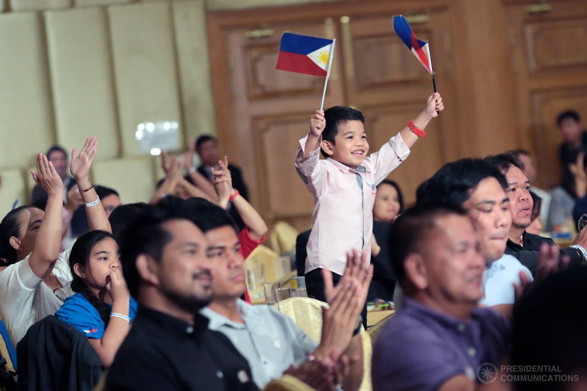 A young supporter waves small Philippine flags while President Rodrigo Duterte is talking on stage during a meeting with the Filipino community at the Horizon Lake View Hotel in Nay Pyi Taw, Myanmar on March 19, 2017.